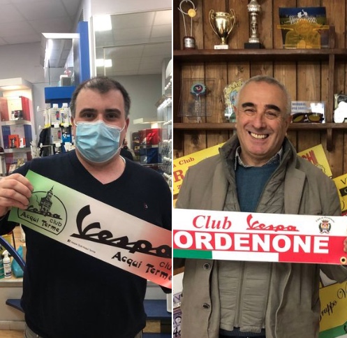 Scambio di fascia fra il Vespa Club Acqui Terme e Alessandro Pozzi del Vespa Club di Pordenone, l’occasione è quella di donare fascia, adesivi e patch per una nobile causa, il progetto “Due ruote per la vita” visibile sulla pagina Facebook: