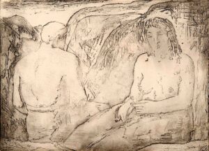 Interessante è il Suonatore di Liuto del 1929, prima opera donata da Martini a Egle Rosmini al momento della loro conoscenza, e comunque l’unica con la dedica. Raffigura un giovane uomo in posizione stante, vestito in abiti rinascimentali: forti le assonanze con un affresco, oggi in parte perduto, in una facciata di un palazzo a Treviso, dove ricorre il particolare del vestito diverso nelle due gambe. Importante poi il ciclo di incisioni eseguite a Blevio nell’estate del 1935 su soggetti già trattati anche in scultura – come L’Attesa e Ratto delle Sabine – o già presenti in altre incisioni precedenti – come L’uragano; altre però sono nuove come Il fabbro inserito nell’antro oscuro come un Vulcano moderno o Il Samaritano che sembra partecipare anche fisicamente al dolore del corpo vulnerato del povero. Il fatto che non sussistono riscontri stilistici tra le opere plastiche modellate a Blevio nello stesso frangente e queste opere grafiche (discrasia evidente nel caso del bassorilievo del Ratto delle Sabine in mostra) attesta che Martini accedeva a mezzi espressivi diversi proprio per staccare un registro espressivo dall’altro. In queste incisioni la trama delle linee è fittissima fino a oscurare la superficie, quasi a emulazione della maniera nera.
