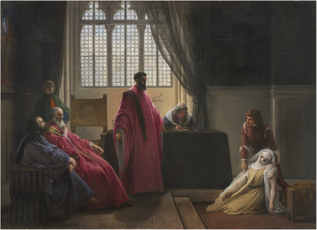 La prima sala è dunque dedicata alla pittura di storia, considerato il “genere” più nobile della pittura, vi troviamo quattro importanti lavori di Francesco Hayez (1791-1882), tra cui lo splendido Venere che scherza con due colombe (1830), Ritratto di Gentildonna (1835) e l’imponente Prete Orlando da Parma inviato di Arrigo IV di Germania e difeso da Gregorio VII contro il giusto sdegno del sinodo romano (1857); accanto ad essi opere di Ludovico Lipparini (1800-1856) e Michelangelo Grigoletti (1801-1870), artisti di rilievo nonché figure chiave nella formazione di autori di spessore della generazione successiva, anch’essi presenti in mostra, quali Marino Pompeo Molmenti (1819-1894) e Antonio Zona (1814-1892).