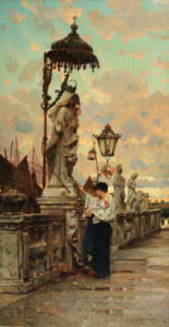 E per chiudere questa triplice sezione di vita quotidiana alcune tele dedicate agli idilli amorosi, un soggetto a metà strada tra il genere e il vero molto amato e frequentato dai pittori del secondo Ottocento: al bellissimo Idillio (1884) di Luigi Nono, si aggiungono tele con indimenticabili figure di giovani fidanzati e sposi di Favretto, Tito, e di Alessando Milesi con un altro Idillio (1882 circa) e Corteggiamento al mercato (1887 circa).