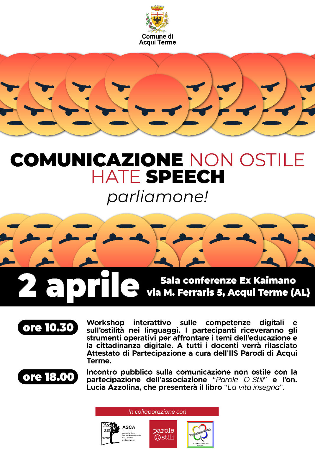 Il Comune di Acqui Terme organizza una giornata, che si svolgerà sabato 2 aprile nella sala Ex Kaimano in via Maggiorino Ferraris 2 ad Acqui Terme, dedicata alla sensibilizzazione contro la violenza delle parole. L’evento è organizzato dal Comune di Acqui Terme con la collaborazione di Asca, dell’associazione “Parole O_Stili” e l’I.I.S. “Parodi” di Acqui Terme.