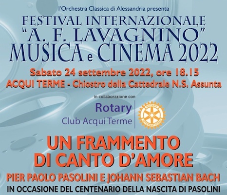In collaborazione con il Rotary Club Acqui Terme, la 22° edizione del Festival Internazionale dedicato ad Angelo Francesco Lavagnino denominato “Musica e cinema”, a cura dell’Orchestra Classica di Alessandria, porta ad Acqui “un evento “colto” di alto spessore dedicato al centenario della nascita di Pasolini”, come lo definisce Luciano Girardengo, il direttore artistico del Festival.