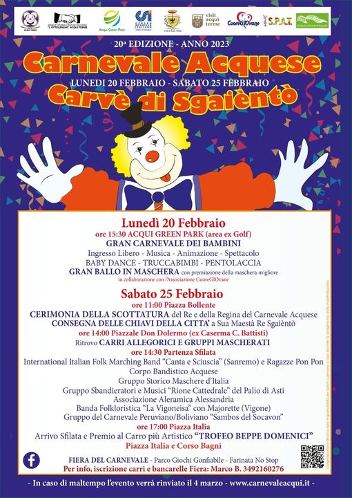 Lunedì 20 e Sabato 25 febbraio, dopo tre anni di assenza forzata, torna il tradizionale Carnevale Acquese con la sua 20^edizione: protagonisti di questa manifestazione saranno il Re e la Regina Sgaientò, maschere storiche della città termale.