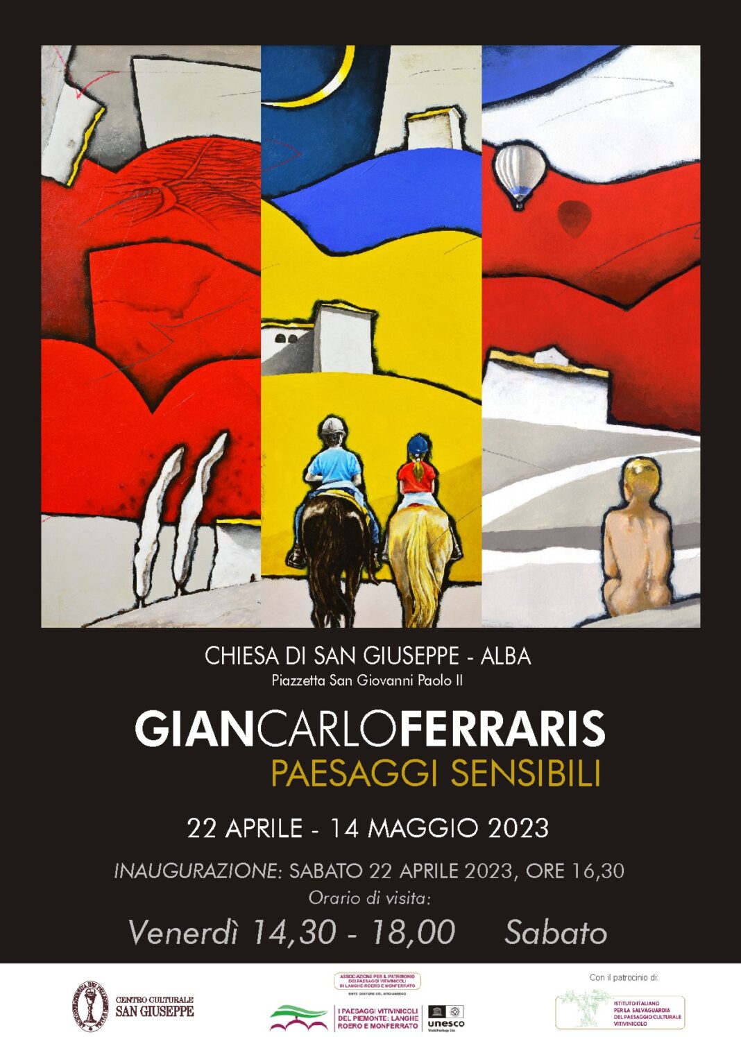 Ore 16,30: inaugurazione e presentazione della mostra d’arte del pittore Giancarlo Ferraris “Paesaggi Sensibili”. La mostra propone una serie di opere dai colori vibranti, dedicate ai paesaggi raccontati a livello simbolico, alle colline presenza imponente e principale del nostro territorio, segnate dal tempo e dall’affetto dei passanti e di chi ci vi è nato.