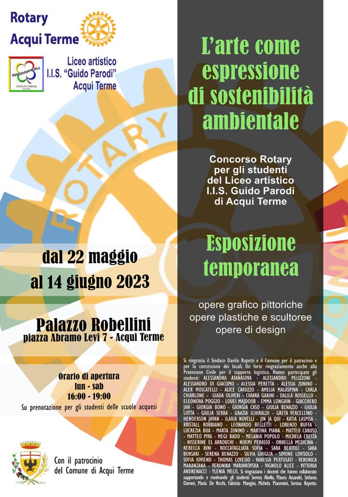 L’arte può essere sostenibile? È la sfida che il Rotary Club Acqui Terme ha lanciato agli studenti del Liceo artistico acquese “Guido Parodi” e che 56 allievi/e hanno raccolto. Fino a mercoledì 14 giugno, le sale di Palazzo Robellini (piazza Abramo Levi 7, orario 16.00 – 19.00 da lunedì a sabato), ospiteranno 57 opere di Alessandra Atanasova, Alessandro Pelizzoni, Alessandro Di Giacomo, Alessia Peretta, Alessia Zunino, Alex Moscatelli, Alice Caruzzo, Alice Vignolo, Amelia Malaspina, Carla Chiarlone, Giada Oliveri, Chiara Garini, Dalila Rossello, Eleonora Poggio, Louei Majdoub, Emma Longhin, Giorgia Bono, Giorgia Caso, Giulia Benazzo, Giulia Lotta, Giulia Serra, Grazia Schiraldi, Greta Vercellino, Ilaria Novelli, Jan Giacchero, Javan Henderson, Jin Ja Qui, Katia Laspisa, Kristall Robbiano, Leonardo Belletti, Lorenzo Buffa, Lucrezia Bua, Marta Zunino, Martina Piana, Matteo Caruso, Matteo Piva, Megi Bado, Melania Popolo, Michela Cresta, Nisserine El Arrouchi, Noemi Perasso, Ornella Medicina, Rebecca Bini, Sara Bertoli, Sara Borsari, Serena Benazzo, Silvia Ghiglia, Simone Lovisolo, Sofia Iovieno, Sofia Roccatagliata, Thomas Lovesio, Vanessa Pertusati, Veronica Maranzana, Veronika Marinkovska, Vittoria Andrenacci, Ylenia Melis.