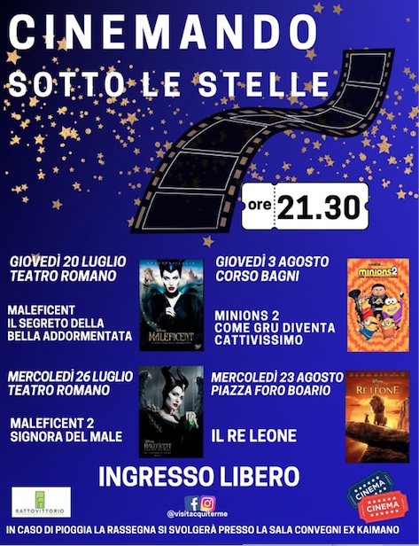 “Torna la magia del cinema all’aperto – commenta l’assessore al Marketing Territoriale, Rossana Benazzo – un appuntamento tradizionale del cartellone estivo che anche quest’anno ci accompagnerà nelle serate di luglio ed agosto, con film adatti a tutte le età e a tutti gusti. Una formula vincente ed intramontabile”. Vi aspettiamo sotto le stelle”.