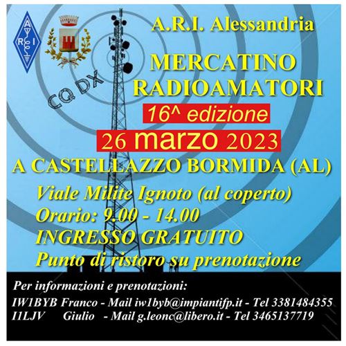 Domenica 24 settembre dalle ore 09:00 alle 13:00 presso il centro polivalente di Castellazzo B.da (AL) via milite Ignoto, ci sarà’ la diciassettesima edizione del mercatino mostra scambio radioamatori e vi assicuro che in questa bellissima occasione non mancherà l’opportunità per tutti e per gli appassionati delle radiotrasmissioni, antenne, componentistica elettronica, valvole, surplus militare, etc. di vedere e sentire il profumo degli oggetti che raccontano la poesia , curiosità, tecnologia e storia passata/moderna della radio.