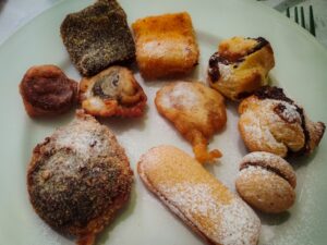 Il dolce: pavesino, semolino, amaretto, bacio di dama, pesca, albicocca, bignè;