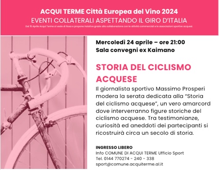 Il giornalista sportivo Massimo Prosperi modera la serata dedicata alla “Storia del ciclismo acquese”, un vero amarcord dove interverranno figure storiche del ciclismo acquese. Tra testimonianze, curiosità ed aneddoti dei partecipanti si ricostruirà circa un secolo di storia.