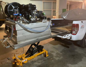 Il nuovo modulo antincendio ha una capacità di 400 litri che consente una certa autonomia di utilizzo, la caratteristica principale è la possibilità, all’occorrenza, di essere spostato da un automezzo all’altro a seconda delle necessità grazie a un carrello elevatore e una struttura a binari su cui farlo scorrere per caricarlo.