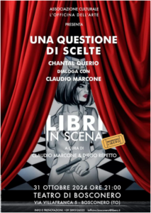 Ancora un appuntamento curato da Claudio Marcone e Diego Repetto, il primo di una serie, con la lettura di qualità al teatro Civico di Bosconero nella serata di giovedì 31 ottobre. Dopo il successo dei suoi precedenti romanzi, Chantal Querio torna a sorprendere i lettori con “Una Questione Di Scelte”: trama avvincente che intreccia mistero, suspense e colpi di scena. L’autrice avrà un dialogo con il critico Claudio Marcone, insieme al quale condividerà il processo creativo della sua opera, affascinando i lettori fin all’ultima pagina. Si tratta di un poliziesco in cui azione e emozione prevalgono sull’aspetto investigativo della vicenda.