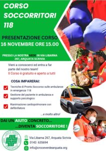 L’Associazione Anpas Croce Verde Arquatese è alla ricerca di nuovi volontari, cittadini maggiorenni con tempo libero a disposizione, per diventare soccorritori e soccorritrici del servizio di emergenza sanitaria 118. A tal fine, organizza un nuovo corso gratuito, che sarà presentato alla cittadinanza sabato 16 novembre 2024, alle ore 15:00, presso la sede di via Libarna 267, Arquata Scrivia.
