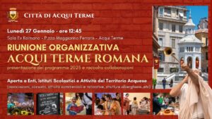 Lunedì 27 Gennaio – ore 12:45 presso la Sala Ex Kaimano ad Acqui Terme è convocata una riunione organizzativa ACQUI TERME ROMANA dedicata a Enti, Istituti Scolastici e Attività del territorio (associazioni, consorzi, attività commerciali e ristorative, strutture alberghiere..etc). L’incontro vedrà la presentazione del programma e la raccolta delle collaborazioni al fine di accrescere la proposta dell’edizione 2025.