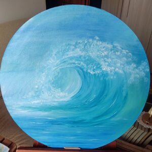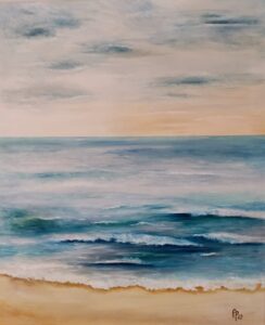 “La mia isola Gallinara” è un omaggio all’origine, al rifugio, alla forza discreta di un luogo dell’anima. “Onde”, dipinto nel 2023, è pura dinamica emotiva, un respiro che si infrange, si ricompone, si espande.