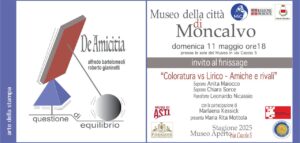 Nel frattempo, prosegue a Moncalvo la mostra “De amicitia” nelle sale del Museo Civico a Moncalvo che terminerà domenica 11 maggio con il consueto concerto negli spazi museali dedicato agli amici e affezionati frequentatori delle sale museali. L’evento, con inizio alle ore 18, porta il titolo “Coloratura vs Lirico – Amiche e rivali” e vedrà il professor Leonardo Nicassio al piano, i soprano Anita Maiocco e Chiara Sorce, il tutto in collaborazione con l’Ente Concerti Castello di Belveglio e la professoressa Marlaena Kessick. Presenterà Maria Rita Mottola di A.L.E.R.AMO. Onlus. Le visite termineranno alle 16.30 e chi entrerà a tale ora potrà partecipare al concerto (sino a esaurimento dei posti disponibili).