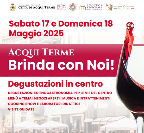 Si svolgerà ad Acqui Terme Sabato 17 e Domenica 18 maggio 2025 la 2a edizione della manifestazione “Brinda con Noi! Degustazioni in Centro”, organizzata dal Comune di Acqui Terme in collaborazione con le attività e associazioni del territorio acquese. Un evento che vede sinergia con l’Enoteca Regionale Acqui “Terme e Vino”, il Consorzio Tutela Vini d’Acqui ed il Consorzio Asti DOCG, e l’Associazione Discepoli Escoffier Italia.