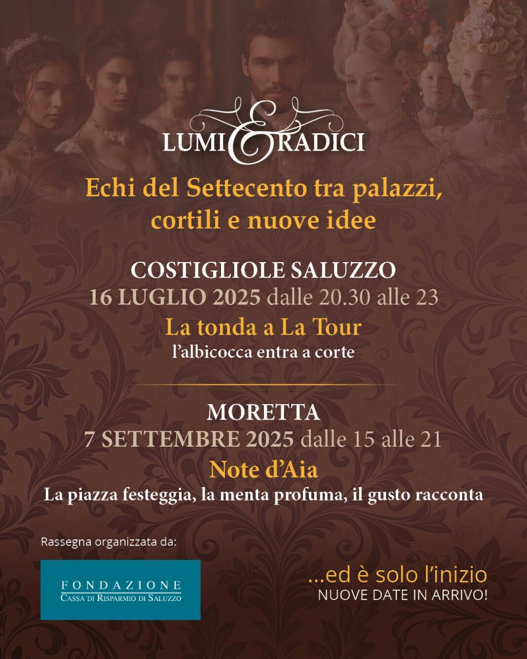 COSTIGLIOLE SALUZZO \ MORETTA – La Fondazione Cassa di Risparmio di Saluzzo presenta “Lumi e radici”, una nuova rassegna culturale che nasce con l’intento di ripercorrere il Settecento saluzzese, restituendo vita e voce a un’epoca ricca di fermento e trasformazioni. Attraverso eventi immersivi, i centri e i palazzi dei Comuni saranno coinvolti in un racconto corale della società del tempo, mettendo in luce tanto la dimensione nobiliare quanto quella contadina. Queste due anime apparentemente distanti, saranno protagoniste di appuntamenti pensati per far dialogare passato e presente: momenti esperienziali, racconti storici, ricostruzioni di usi e costumi, performance artistiche e narrazioni pubbliche si alterneranno nelle piazze e nei palazzi dei comuni coinvolti, restituendo al pubblico la complessità e la vitalità del XVIII secolo.
