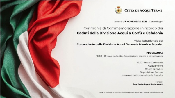 Durante la visita, il Generale Fronda donerà ad Acqui Terme la bandiera della Divisione “Acqui”, che sarà collocata accanto al Monumento ai Caduti nel corso di una cerimonia solenne, a testimonianza del legame di fratellanza e riconoscenza che unisce le due realtà.
