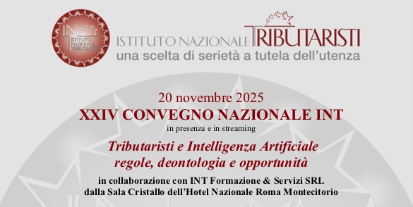 Giovedì 20 novembre si terrà il XXIV CONVEGNO NAZIONALE dell’Istituto Nazionale Tributaristi (INT) dal titolo “Tributaristi e Intelligenza Artificiale regole, deontologia e opportunità”, in presenza e in streaming dalla Sala Cristallo dell’Hotel Nazionale in Piazza Monte Citorio in Roma.