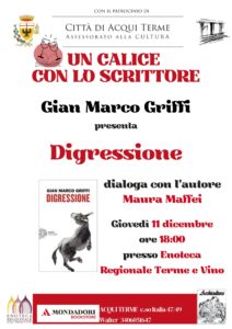 Un infinito, vertiginoso romanzo di formazione, d’amore e di avventura che ci restituisce una visione a volte compassionevole, a volte insostenibile, del nostro tempo: questo è “Digressione”, il nuovo libro di Gian Marco Griffi che tornerà a “Un calice con lo scrittore” giovedì 11 Dicembre alle ore 18.00 nell’Enoteca Terme e Vino.