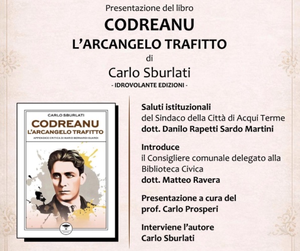 Sabato 7 febbraio 2026, alle ore 16:30, presso la Biblioteca Civica (via Maggiorino Ferraris 15) di Acqui Terme, si terrà la presentazione del volume Codreanu – L’arcangelo trafitto di Carlo Sburlati, già Assessore alla Cultura del Comune di Acqui Terme e per molti anni guida del Premio Acqui Storia.